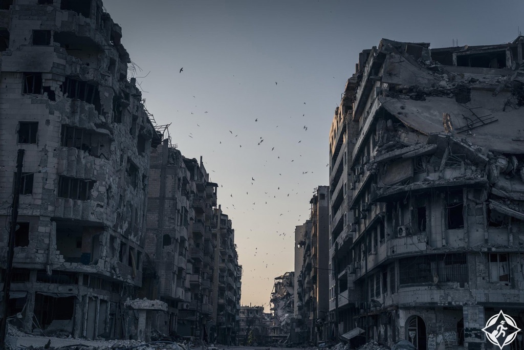 تحلق الطيور فوق المنازل المدمرة في حي الخالدية في حمص، سوريا, وسط السكون الشاسع وسط مدينة حمص المدمرة.