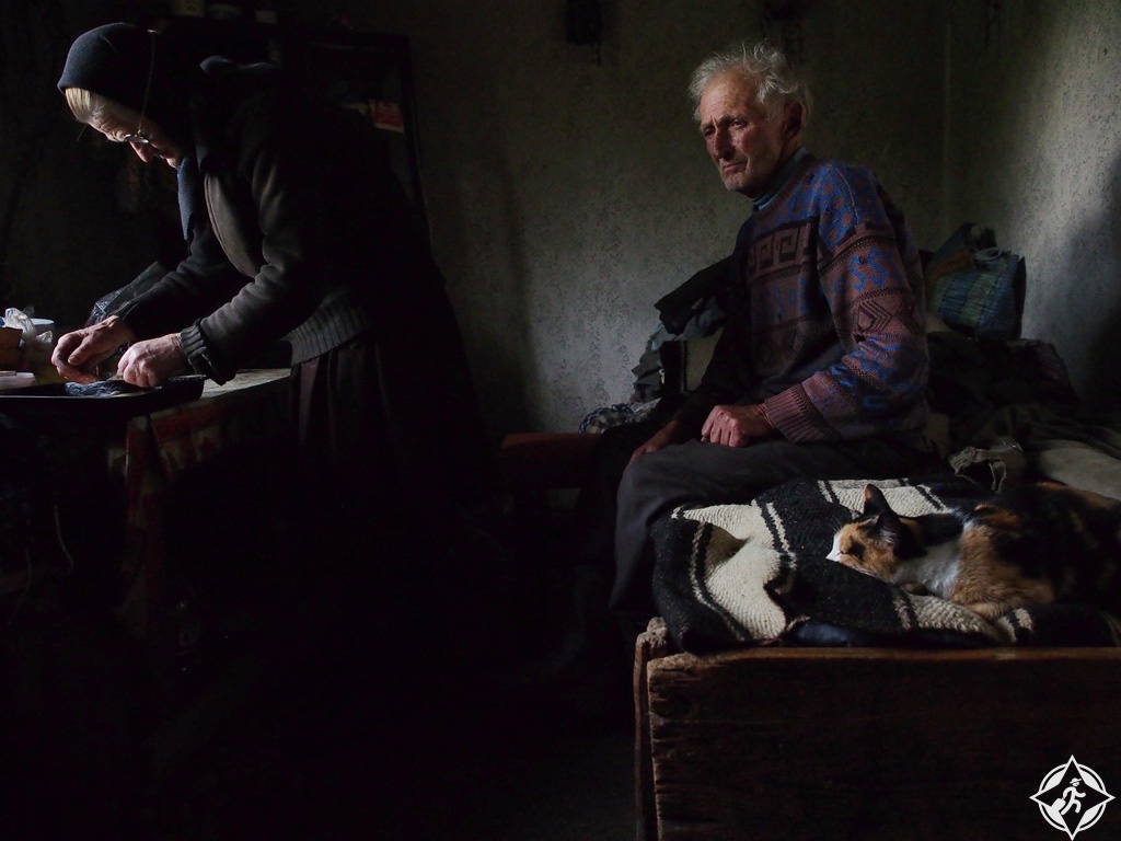 صورة التقطت لرجل كان ينتظر على السرير، تائه في الأفكار, بينما تقوم زوجته بإعداد الخبز والتبرك للقربان المقدس الأرثوذكسي.